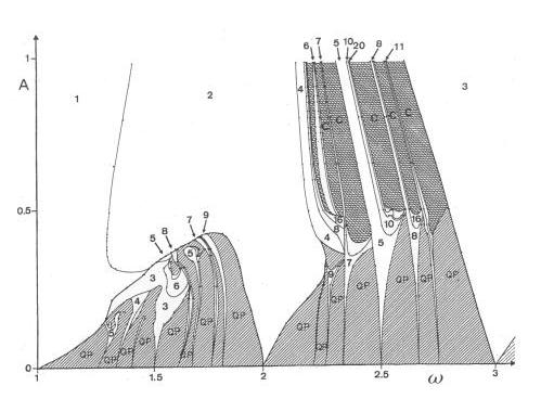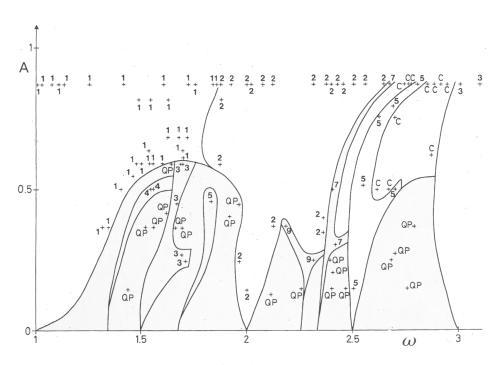 Below: C: chaos. QP: quasiperiodicity. 1,2,3,... : period of glycolysis