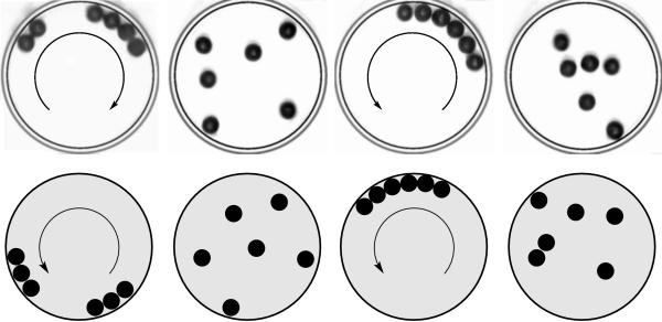 The system shown below consists of N spheres in a dish. They are swirled horizontally and periodically, so that the center of the dish describes a circle (a). Only certain numbers ("magic numbers") of spheres organize into rings (d). This occurs within a wide range of swirling frequencies, swirling amplitudes, or dish sizes.