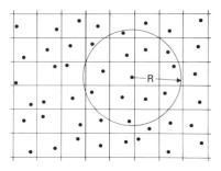 A drawback in CA has been that the shape of the simulated spatial structures depends on the shape of the cells. To avoid this, we used a quasi-stochastic spatial discretization (shown below; circular neighbourhood with radius R). Such a CA renders isotropy (i.e. "round" structures) and can thus be used for quantitative analyses that require well-defined curvatures, e.g. the eikonal relationship.