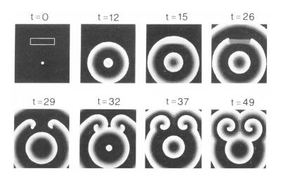 The simulation example shown below is that of depolarizing waves in the heart (t=12). They emerge from the sinus node (point at t=0) and they break at a region of transitory lower repolarization rate (rectangle; t=0). Such a region may appear in scars after an infarct. After breaking, the two free wave ends curl into spirals. These spirals are much faster than the normal waves. This causes an abnormally fast heart beat (tachycardia), which is usually medicated by a total heart depolarization that permits the sinus node to reassume its function.