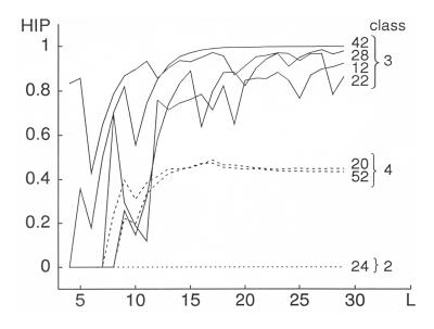 Quantification of Wolfram-automata (rule numbers at the right of the curves). HIP: fraction of periods larger than 1. L: Length of automaton: